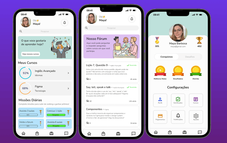 🎯 Pontos: Obtidos ao assistir aulas, completar desafios e interagir no fórum.